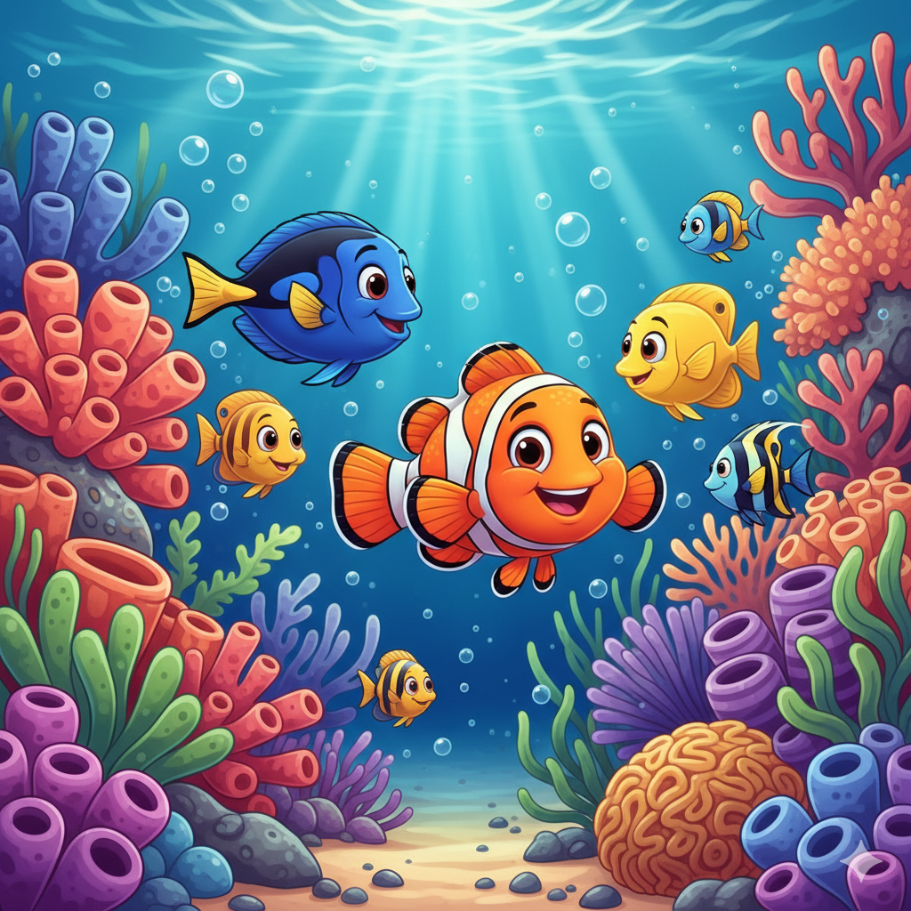 Once upon a time, in a vibrant coral reef, lived a cheerful clownfish named Finny. His home was a bustling underwater city, painted with corals of every color imaginable, and teeming with his friends: the shy seahorses, the graceful angelfish, and the speedy