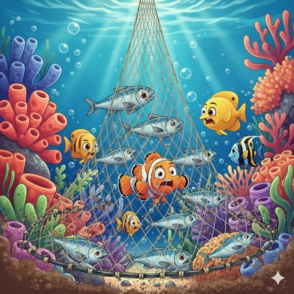One sunny morning, a shadow fell over the reef. A fishing net, wide and strong, descended into their playful world. Finny, caught up in a game of chase, didn’t see it until it was too late. He struggled and wiggled, but the net held him fast. Soon, he was pulled out of the sparkling blue water, leaving behind his colorful home and worried friends.