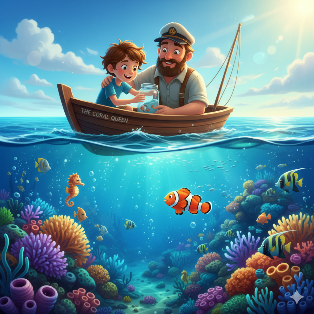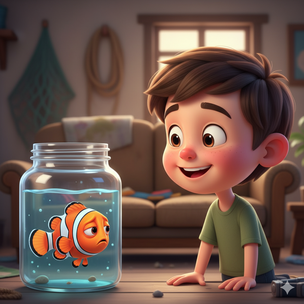 Captain Bob took Finny home and gently placed him in a glass jar. When Leo arrived, his eyes lit up with excitement. “A clownfish! He’s wonderful, Dad!” Leo carefully placed some shiny pebbles at the bottom of the jar, trying to make it a nice new home for Finny.