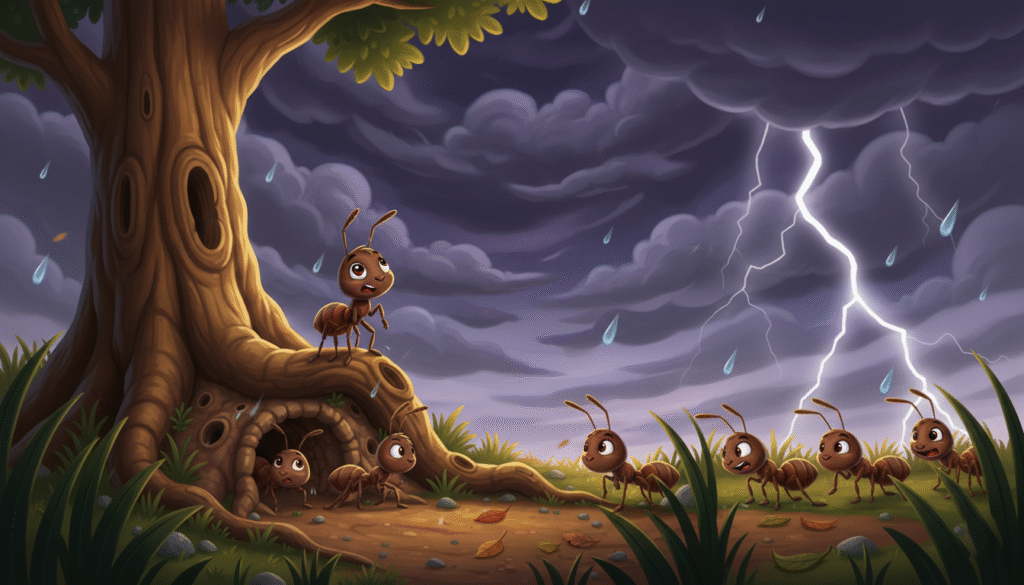 One sunny day, the sky turned a strange, heavy purple. The air felt thick, and Pip heard a deep, scary rumble in the ground. Pip remembered the old stories of the “Sky Tears”—a giant, dangerous flood! He knew the colony’s entrance would soon be swamped.